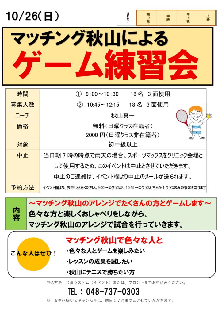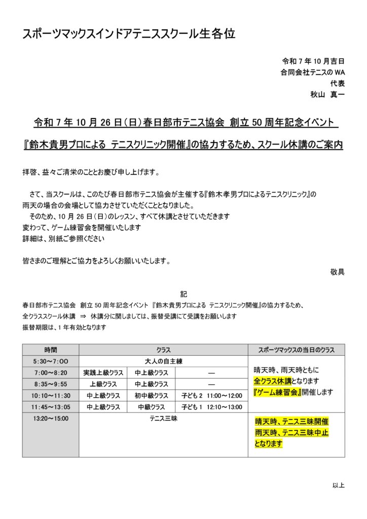 そのため、10 月26 日(日)のレッスンは、休講となります 皆さまには、ご迷惑をおかけします 休講分に関しましては、振替受講でご対応お願いいたします チケットの期限1年間有効とさせていただきます ただし、晴天時は、『庄和コート』を使用するため、スポーツマックスは、ゲーム練習会のイベントを開催しま す。